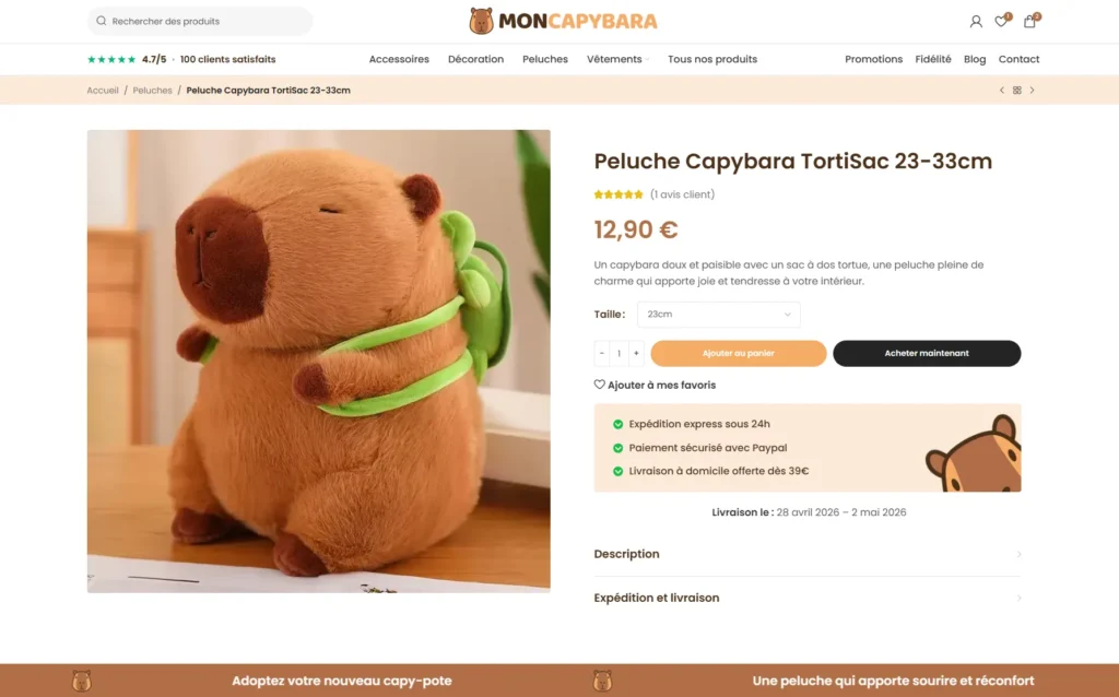 Sur cet exemple de la boutique MonCapybara.com, on peut voir une transparence totale pour les clients. Un délai de livraison annoncé, un paiement sécurisé avec Paypal, des mentions légales, des conditions générales claires et de vrais avis clients vérifiés. C’est une boutique de niche, avec des prix très intéressants et un service client réactif. Un bel exemple d’une boutique qui pratique le dropshipping de manière professionnelle, sans arnaquer ses clients.
